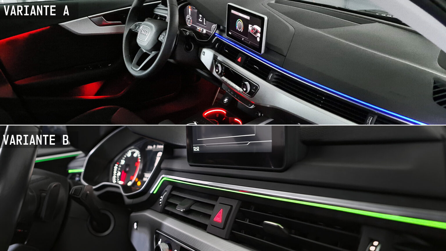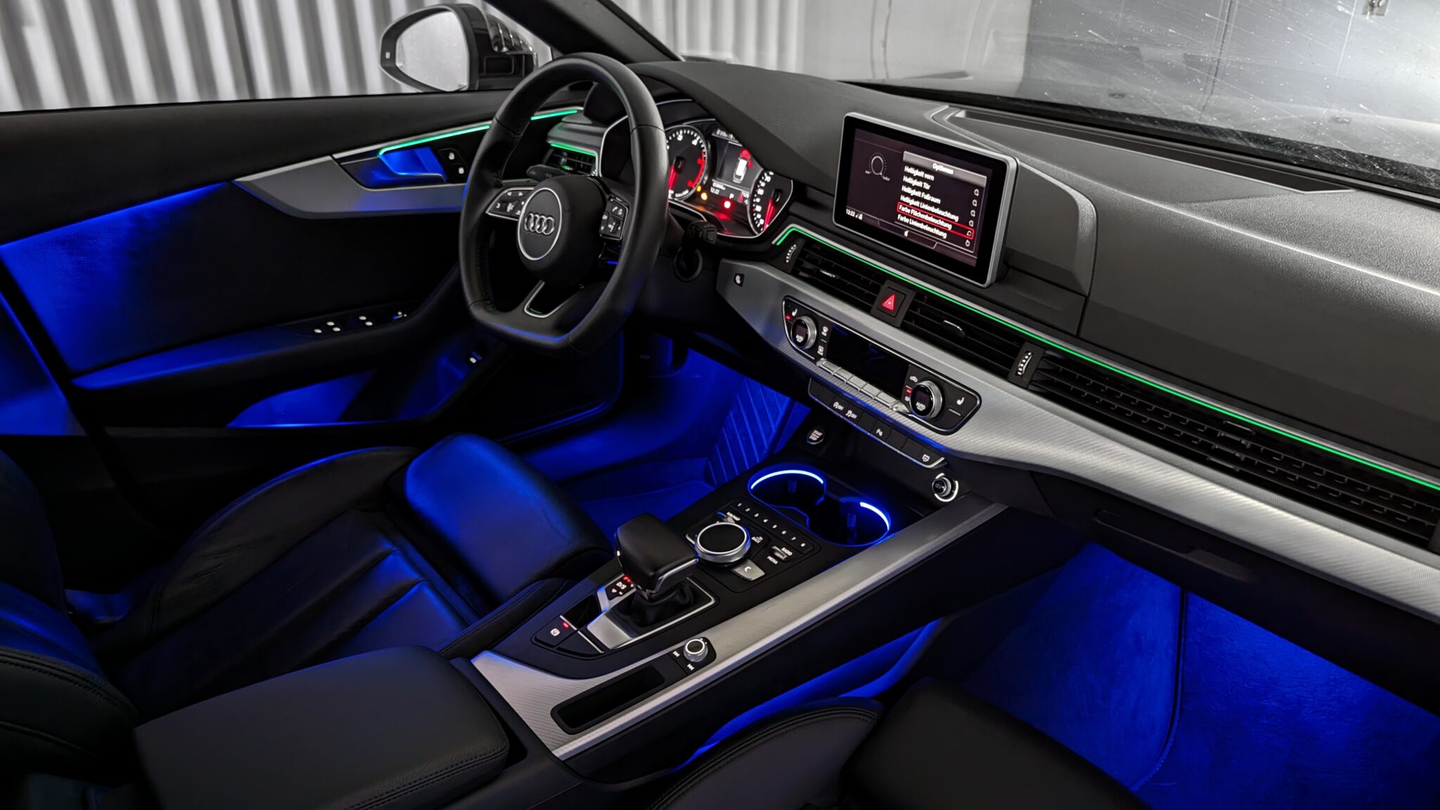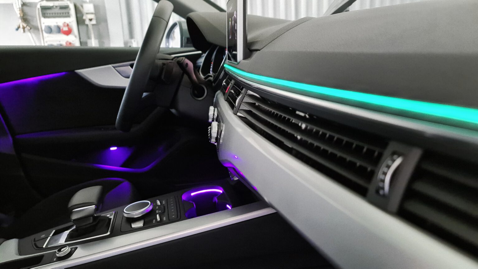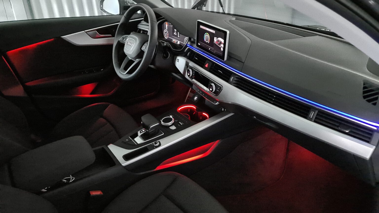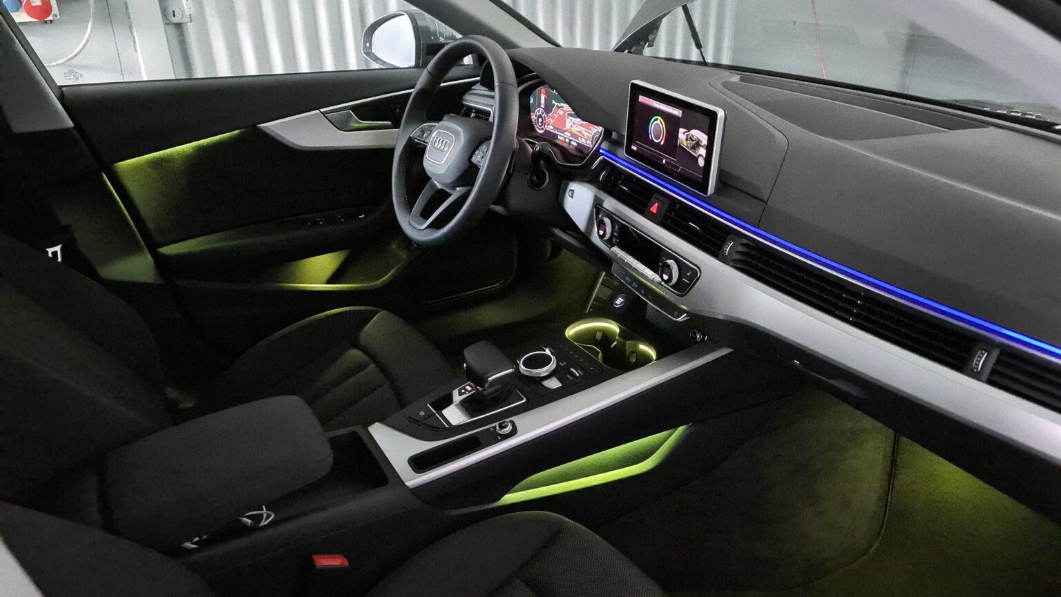 Nachrüstung der mehrfarbigen Ambientebeleuchtung im Audi A4 B9 (A5 F5) steuerbar über MMI Plus. Vollständige Integration mit Flächen- & Linienbeleuchtung, He.