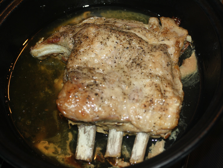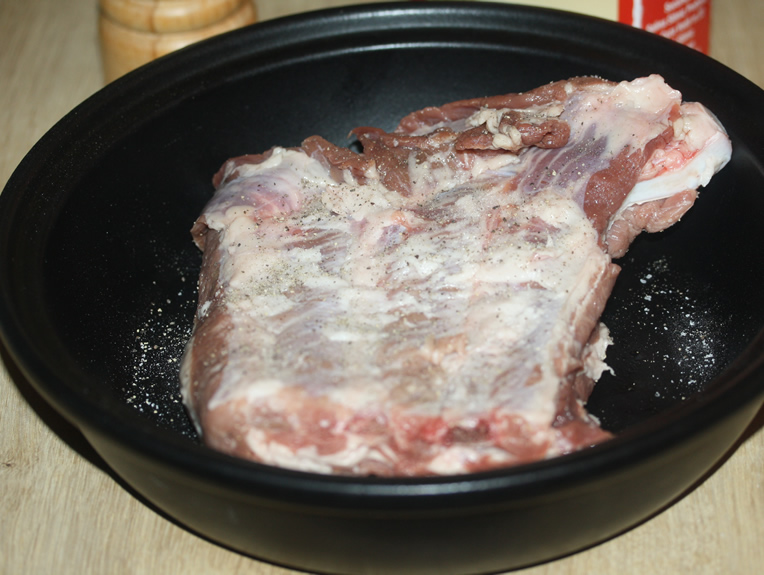 Asezati costitele in tava cu partea osoasa in jos. Acoperiti tava cu capac (sau folie de aluminiu) si dati la cuptor la 140C pana sunt facute (testati cu o furculita si cand simtiti ca intra usor in carne si daca trageti se desprinde de pe os, sunt gata; fix 3 ore a durat pentru bucata mea). Scoateti carnea din cuptor si scurgeti grasimea din.