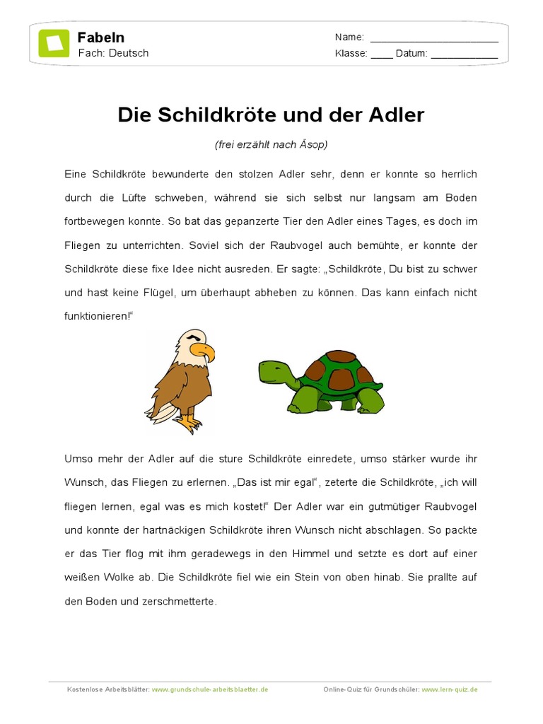 Arbeitsblätter Fabeln. Auf dem kostenlosen Arbeitsblatt sollen die Schüler die Fabel "Die Schildkröte und der Adler" lesen und einige Aufgaben dazu bearbeiten. Jetzt downloaden!