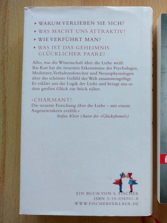 ISBN 9783100383013. Gebunden, 250 Seiten, 18,90 EUR. Gebraucht bei Abebooks. Klappentext. Warum verlieben wir uns? Wie verführt man? Was macht uns attraktiv? Macht Liebe blind? Ziehen sich Gegensätze an? Schadet Eifersucht? Warum scheitern manche Beziehungen? Und was ist das Geheimnis glücklicher Paare?