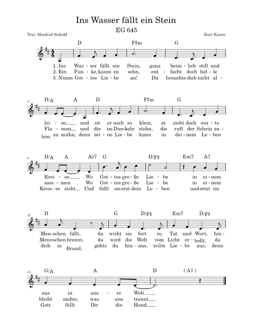 Ins Wasser fällt ein Stein (EG, Nummer je nach Regionalteil verschieden) Text: Manfred Siebald 1973 Melodie: Kurt Kaiser 1965. 1. Ins Wasser fällt ein Stein, ganz heimlich still und leise, und ist er noch so klein, er zieht doch weite Kreise. Wo Gottes große Liebe in einen Menschen fällt, da wirkt sie fort in Tat und Wort, hinaus in unsre.