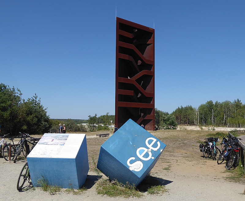 Landmarke. Der 30 Meter hohe Aussichtsturm wurde aus Cortenstahl errichtet und ist mit einer rostroten Patina überzogen. Die futuristische Architektur mit dreieckigem Grundriss am Sornoer Kanal zwischen dem Sedlitzer See und dem Geierswalder See zählt zu den Besonderheiten im Lausitzer Seenland. Die Landmarke ist etwas abseits vom Weg zu finden.