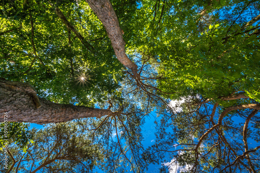 Der Strahlenkranz der Sonne leuchtet durch die Baumkronen von Kiefern Stock Photo Adobe Stock