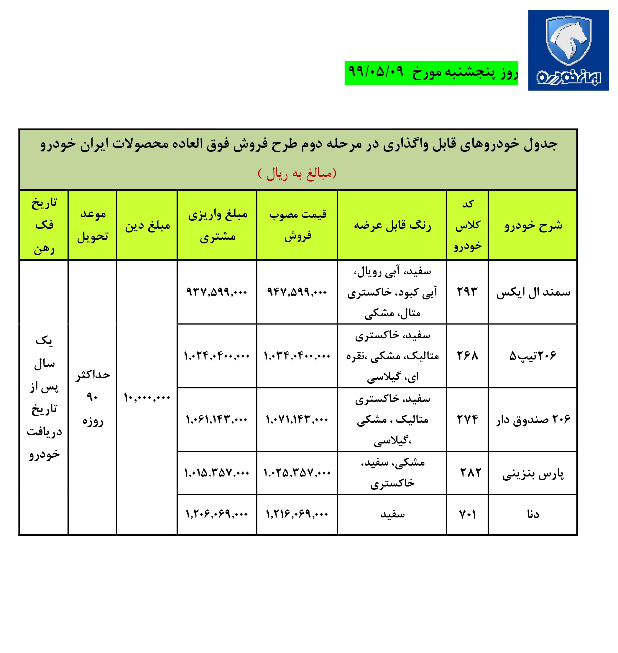 تاریخ شروع و مهلت ثبت نام. طرح فروش فوق العاده (با موعد تحویل ۳ ماهه) برخی محصولات شرکت ایران خودرو در سامانه یکپارچه فروش خودرو (با روش قرعه کشی) مطابق جدول بخشنامه از روز سه شنبه موره ۱۴۰۱/۰۲/۲۷ شروع و تا پایان روز سه.